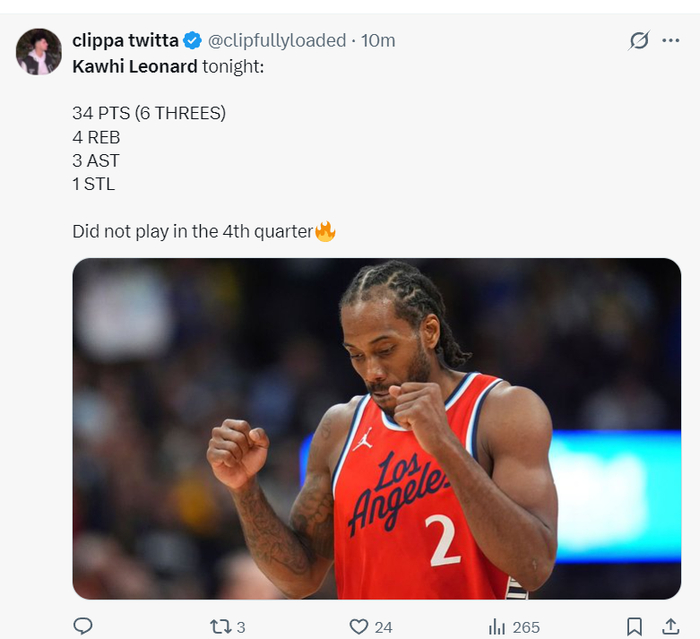 末节小卡还没有登场,快船就已经再度拉开打10分以上了,随后基德放弃比赛了,小卡直接三节打卡下班了。全场比赛30分钟,19中11,三分10中6,罚球9中6,拿到34分4篮板3助攻1抢断,命中率57.9%,三分命中率60%,真实命中率74%,正负值+11。